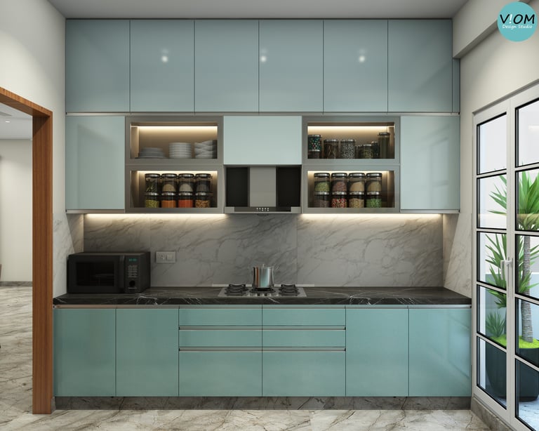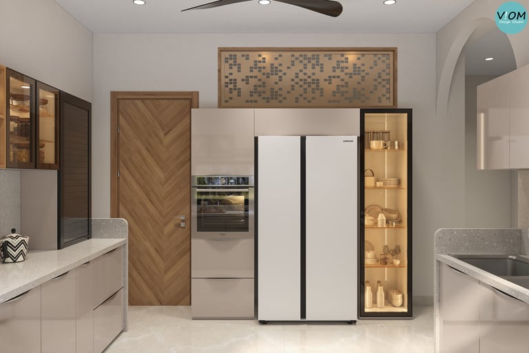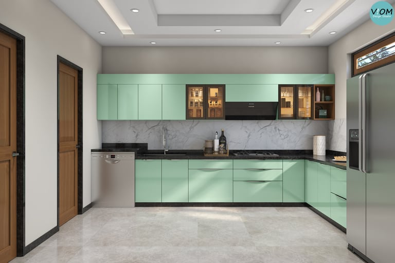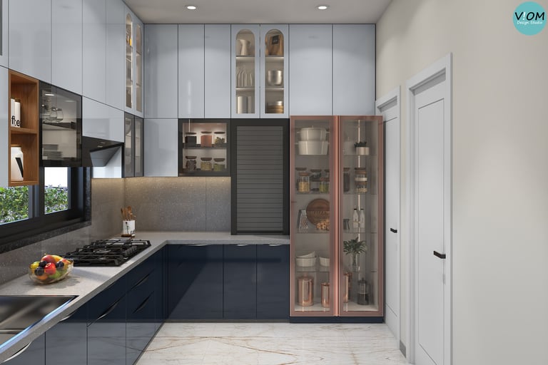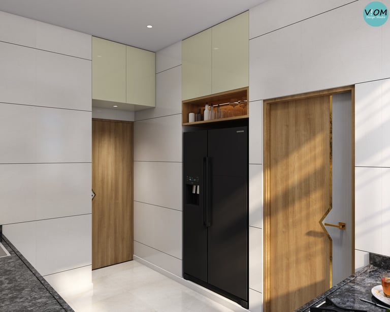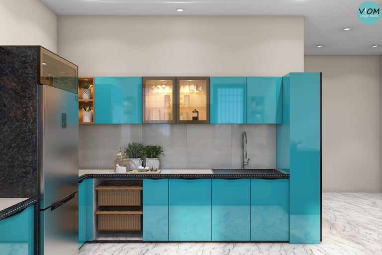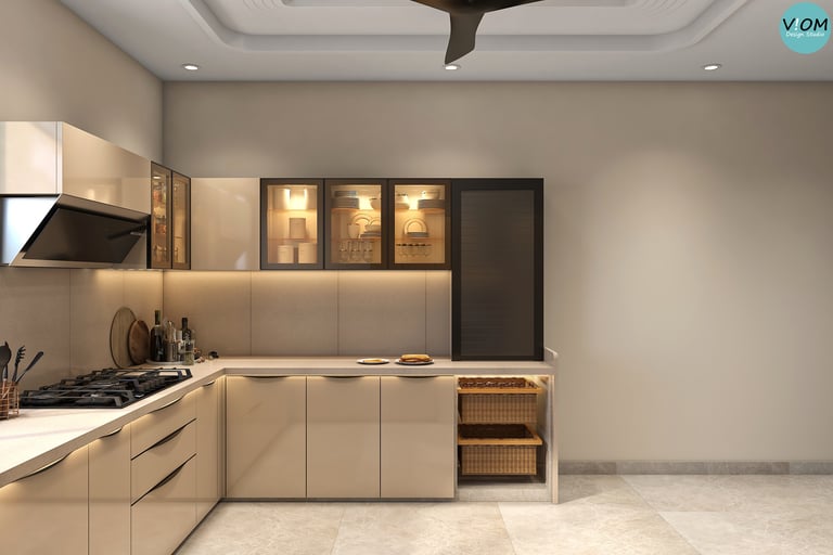 Internal Storage Visualization: We design the inside of your cabinets too—pull-outs, pantry units, and cutlery organizers are planned to perfection.